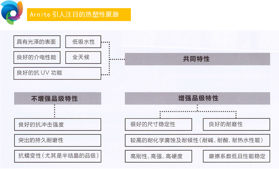 Arnite是DSM工程塑料公司熱塑性聚酯的產(chǎn)品名。Arnite A和D是以對聚對苯二甲酸丁乙二醇酯(PET)為基礎(chǔ)的,而Arnite T是以聚苯二甲酸丁二醇酯(PBT)為基礎(chǔ)的。Arnite產(chǎn)品有各種品級:玻纖增強、礦粉增強和混合增加,同時又分為注塑品級和擠出品級。他們特別適合那些精密注塑產(chǎn)品。此外,我們還生產(chǎn)各種UL公司認可的阻燃品級。該產(chǎn)品的主要優(yōu)點是:低吸水性、高尺寸穩(wěn)定性、良好表面光澤、極好的介電性能以及耐濕耐化學(xué)腐蝕性能,其中增加品級還提供了很好的強度。